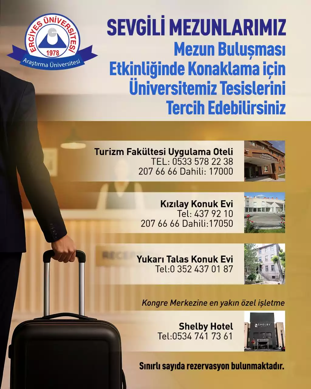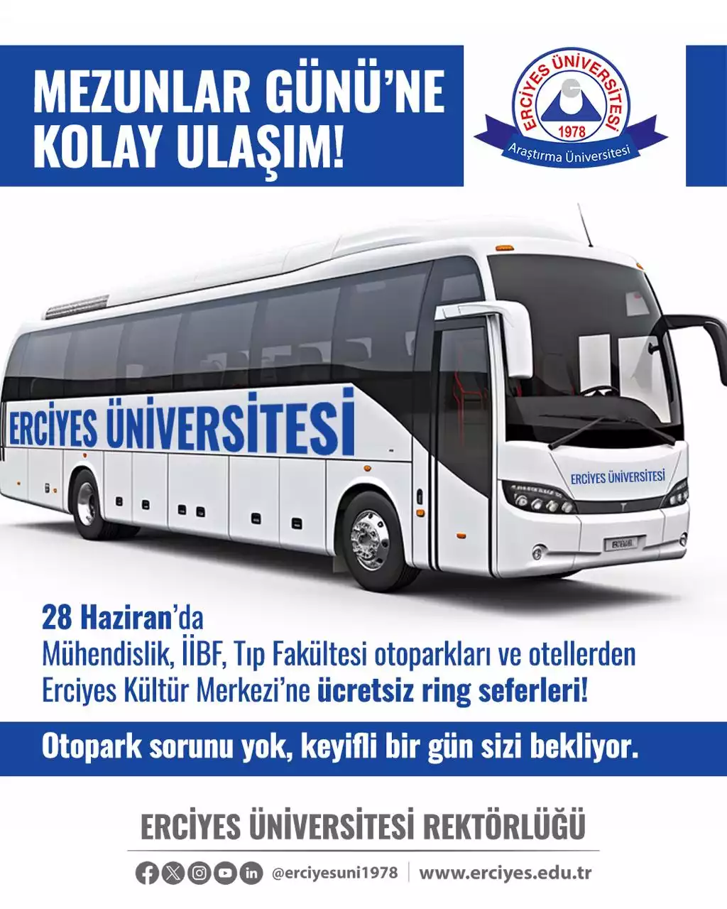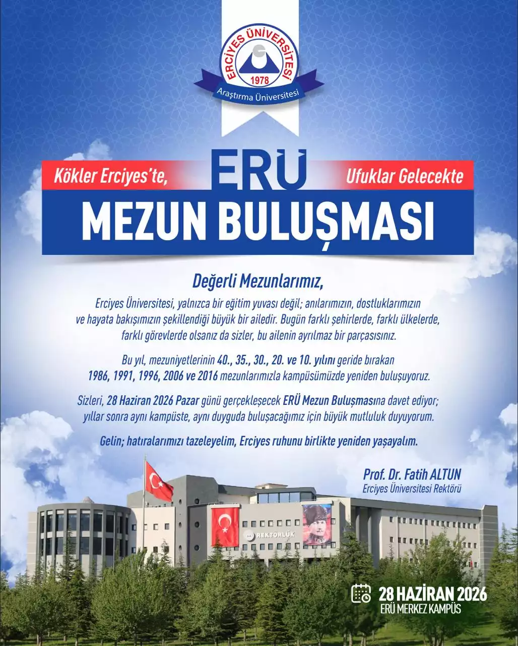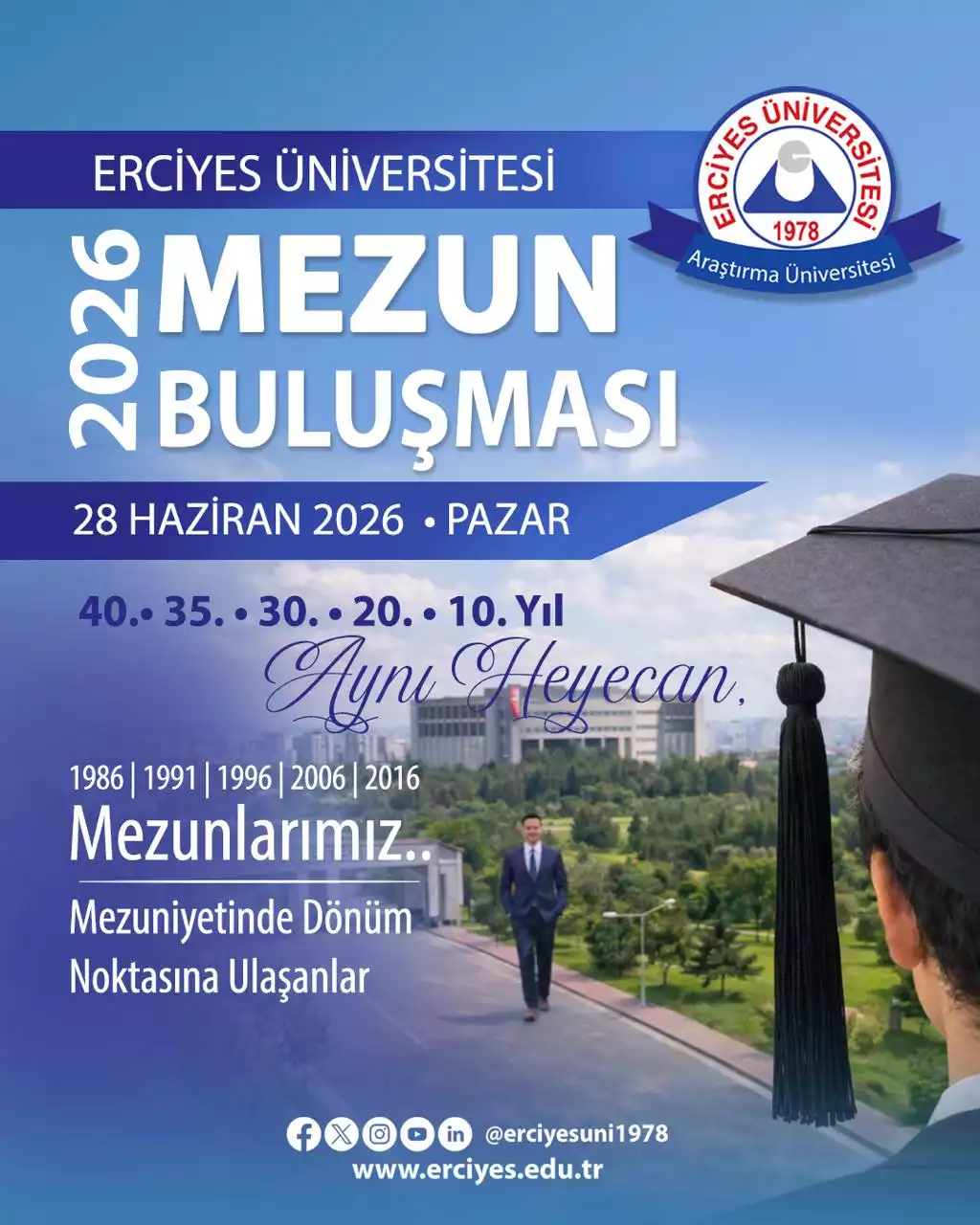 Erciyes Üniversitesi Mühendislik Fakültesi olarak sizleri yeniden kampüsümüzde ağırlamaktan büyük mutluluk duyacağız. 28 Haziran 2026 Pazar günü, Erciyes Üniversitesi Merkez Kampüsünde gerçekleşecek olan ERÜ Mezun Buluşması’na katılımınız bizler için çok değerli.