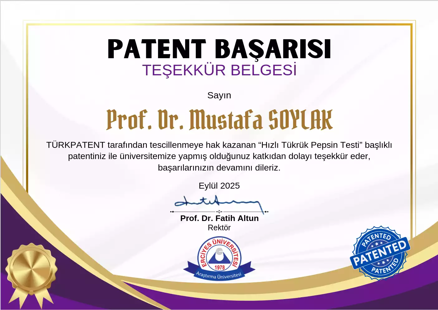 TÜRKPATENT tarafından tescillenmeye hak kazanan “Hızlı Tükrük Pepsin Testi” başlıklı patentiniz ile üniversitemize ve fakültemize yapmış olduğunuz katkıdan dolayı teşekkür eder, başarılarınızın devamını dileriz.