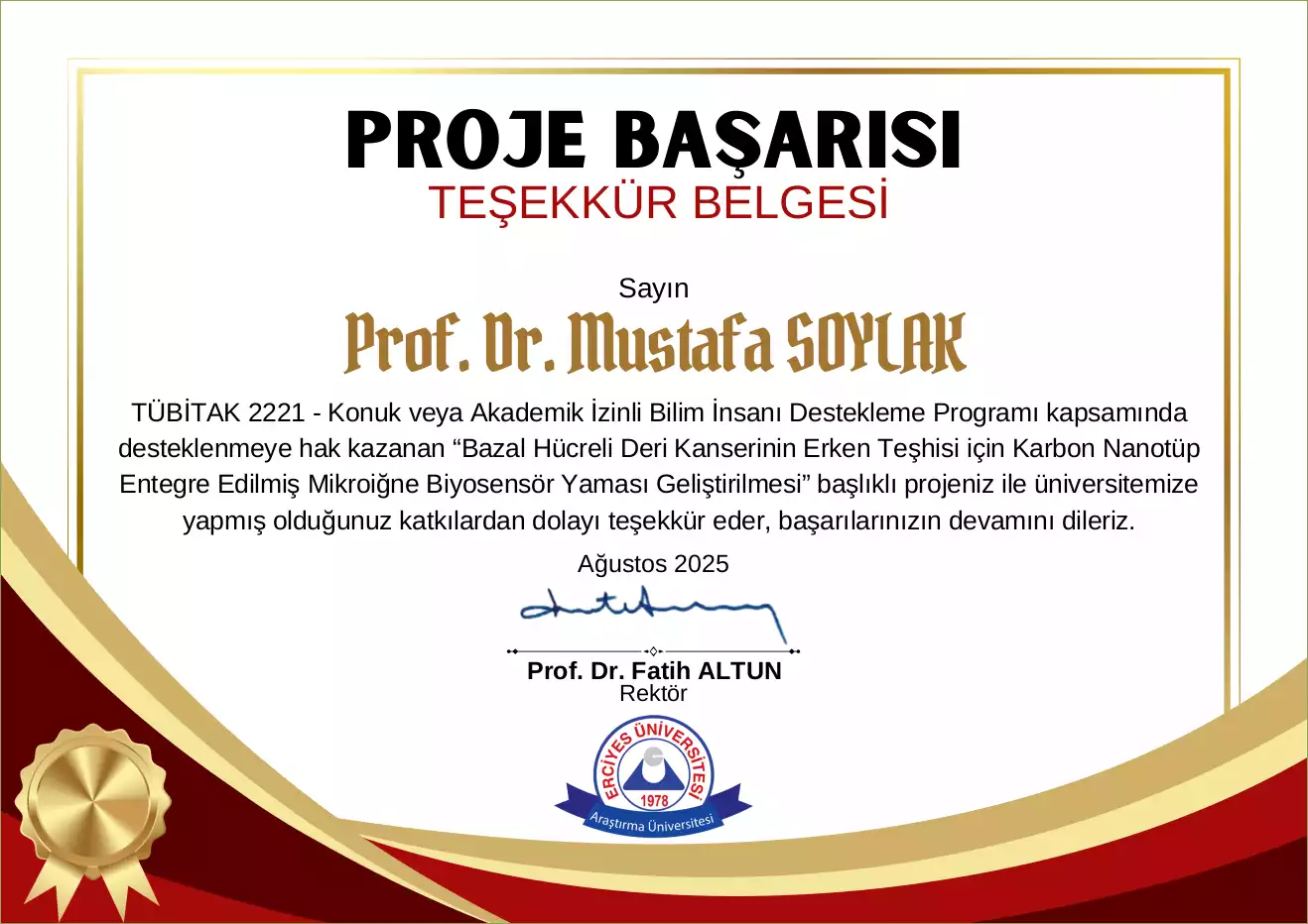 Fakültemiz Kimya Bölümü Öğretim Üyesi Prof. Dr. Mustafa Soylak'ın, TÜBİTAK 2221 - Konuk veya Akademik İzinli Bilim İnsanı Destekleme Programı kapsamında “Bazal Hücreli Deri Kanserinin Erken Teşhisi için Karbon Nanotüp