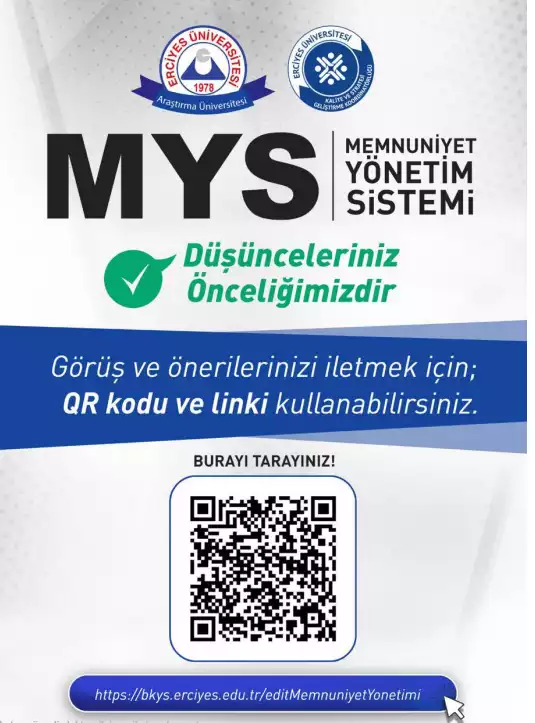 Üniversitemizde uygulanmakta olan Memnuniyet Yönetim Sistemi (MYS) kapsamında, öğrencilerimiz ile idari ve akademik personelimizin memnuniyet, öneri, talep ve görüşlerini etkin biçimde iletebilmeleri amaçlanmaktadır.