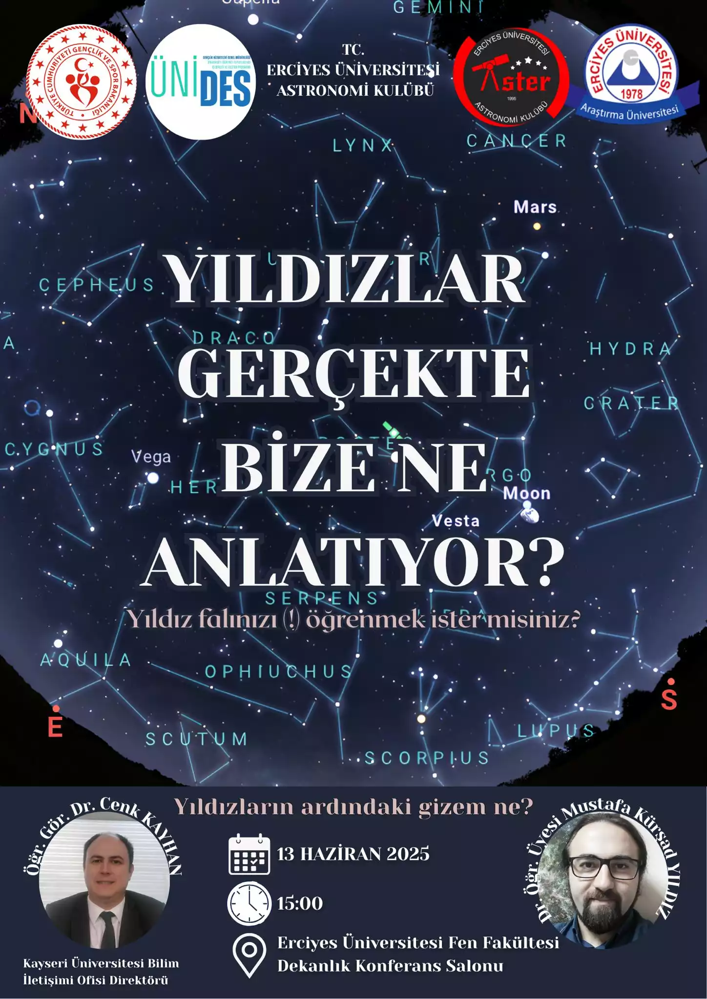 Yıldız falınızı (!) öğrenmek ister misiniz? Peki ya yıldızların ardındaki gerçekleri öğrenmek ister misiniz? gibi soruların cevap bulacağı bu konferansımıza tüm öğrenci ve personelimiz davetlidir.