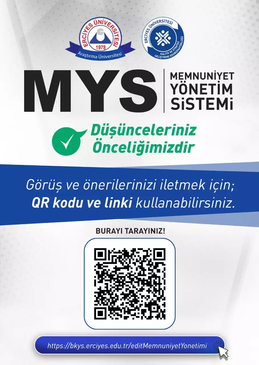 Memnuniyet Yönetim Sistemi (MYS), Üniversitemizin öğrenci, personel ve dış paydaşlarının istek, memnuniyet, şikayet, fikir ve önerilerini yazabilecekleri bir platformdur.